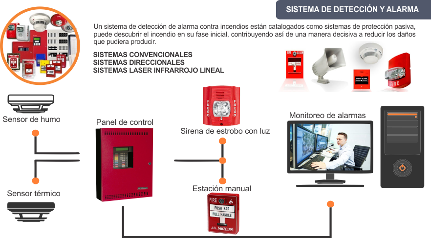 Un sistema de detección de alarma contra incendios están catalogados como sistemas de protección pasiva, puede descubrir el incendio en su fase inicial, contribuyendo así de una manera decisiva a reducir los daños que pudiera producir.